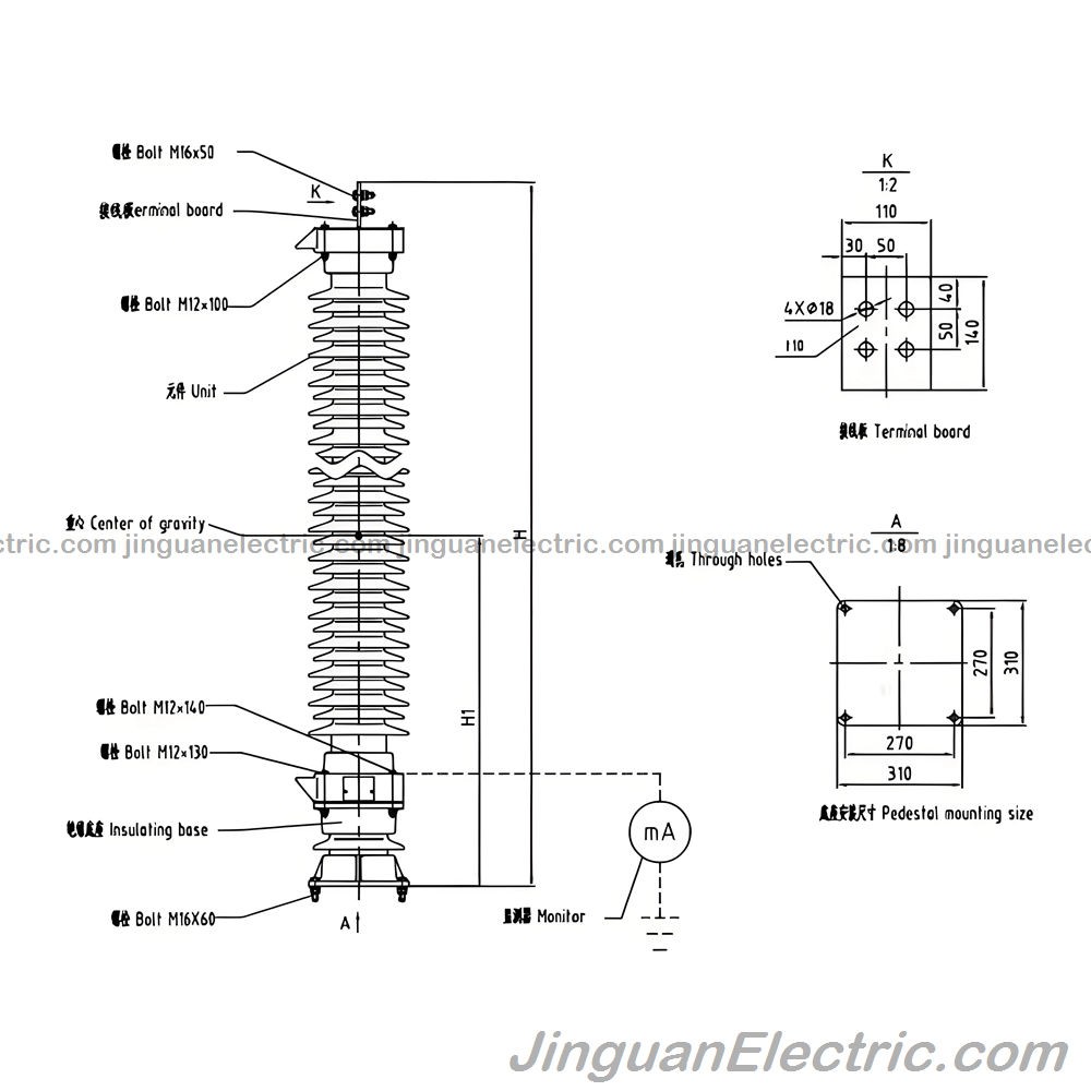 | 额定电压 (kV) | MCOV (kV) | 工频1min耐受 (kV) | 雷电冲击耐受 (kV) | 雷电冲击8/20μs残压 (10kA) (kV) | 陡波冲击1/20μs残压 (10kA) (kV) | 切换冲击30/60μs残压 (1kA) (kV) | 高度 (mm) |