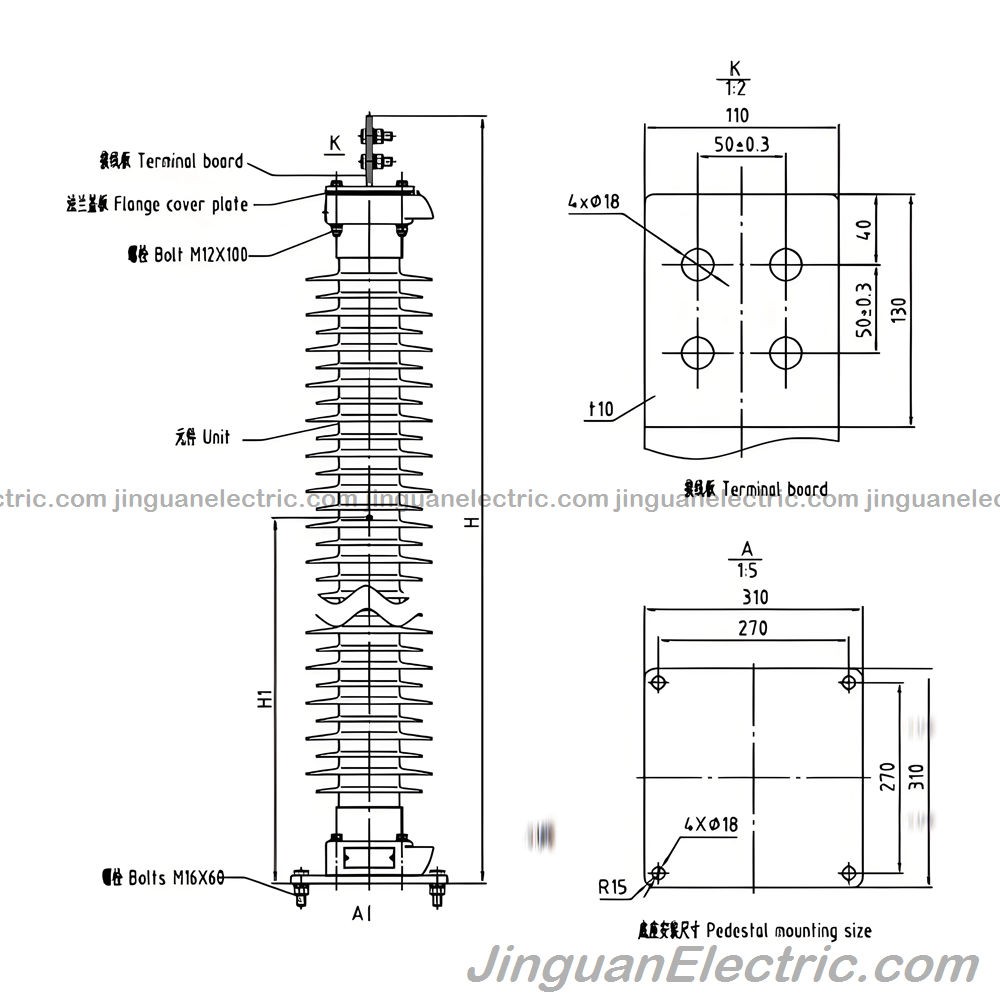 | 额定电压 (kV) | MCOV (kV) | 绝缘耐受电压 (kV) | 雷电冲击绝缘耐受电压 (kV) | 雷电冲击8/20μs最大残压 (10kA) (kV) | 高度 (mm) | 参考图 (mm) | 工频1min (kV) |